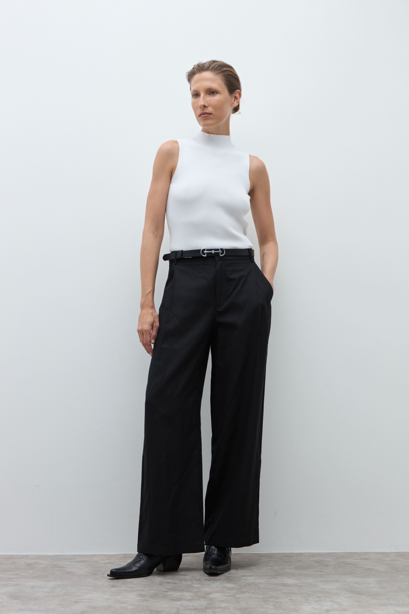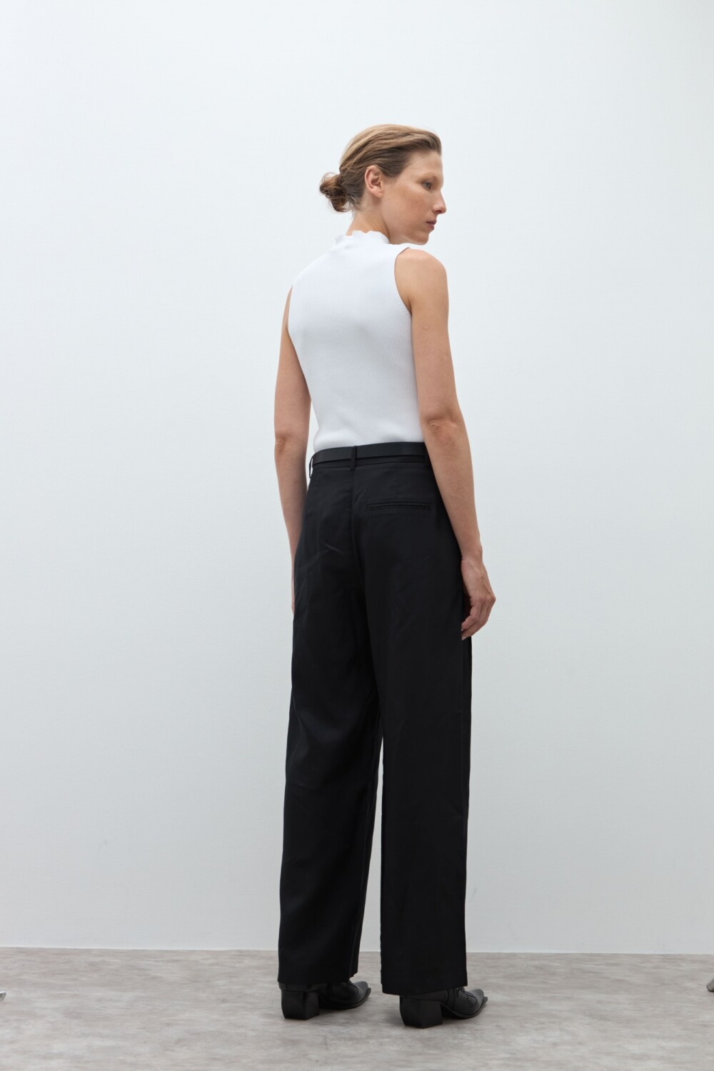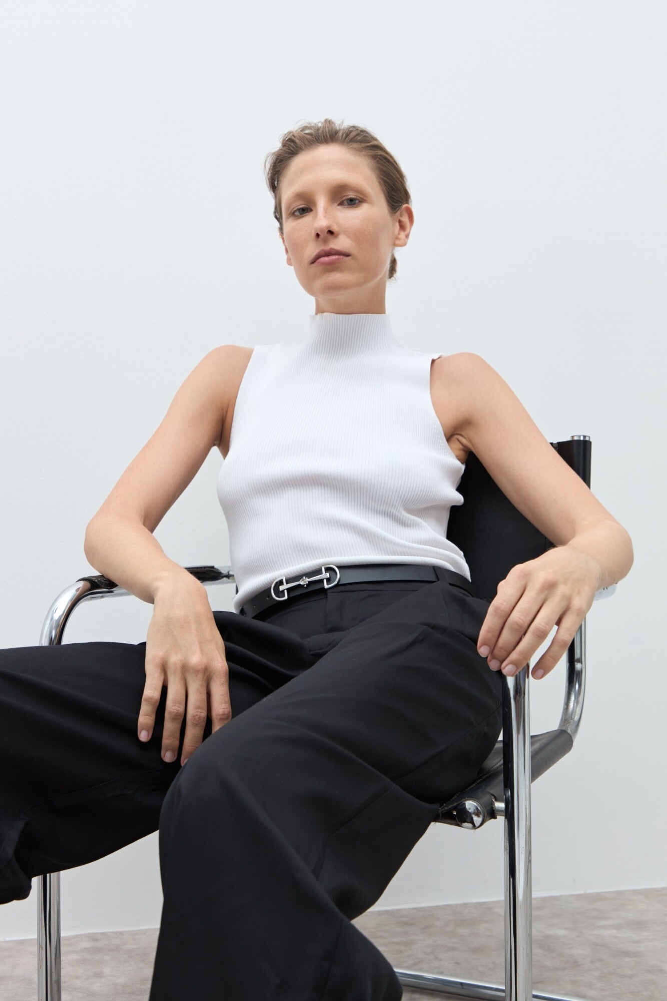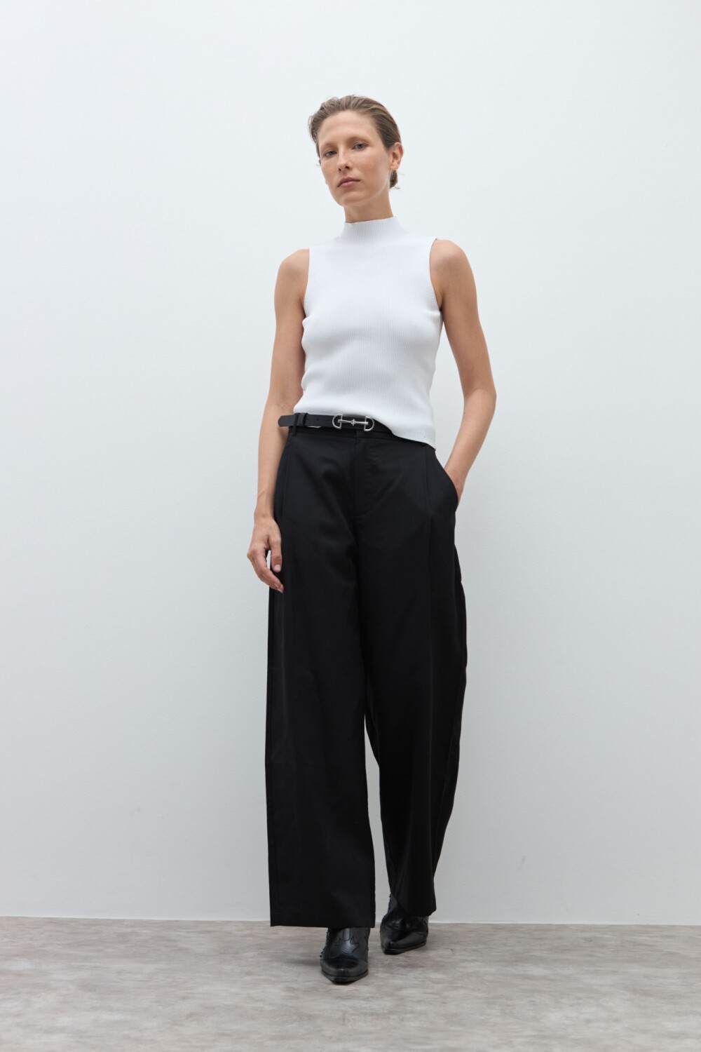 Top de cuello subido y manga sisa.