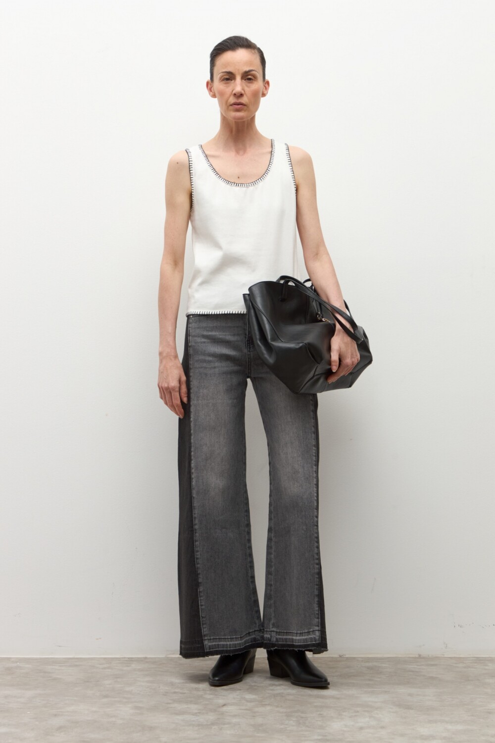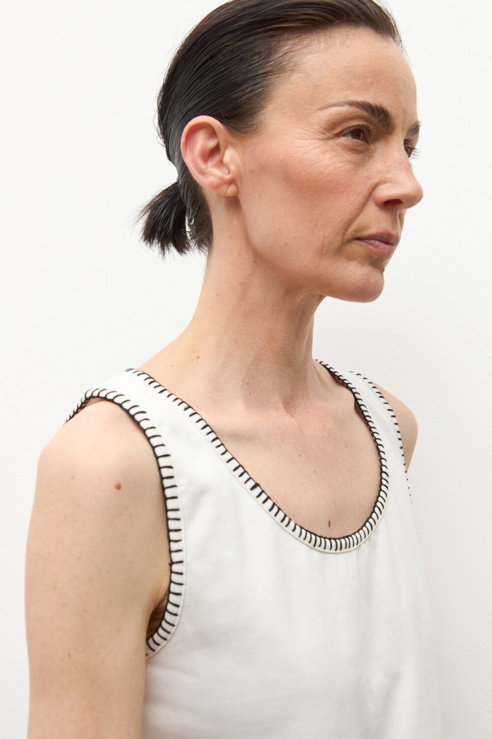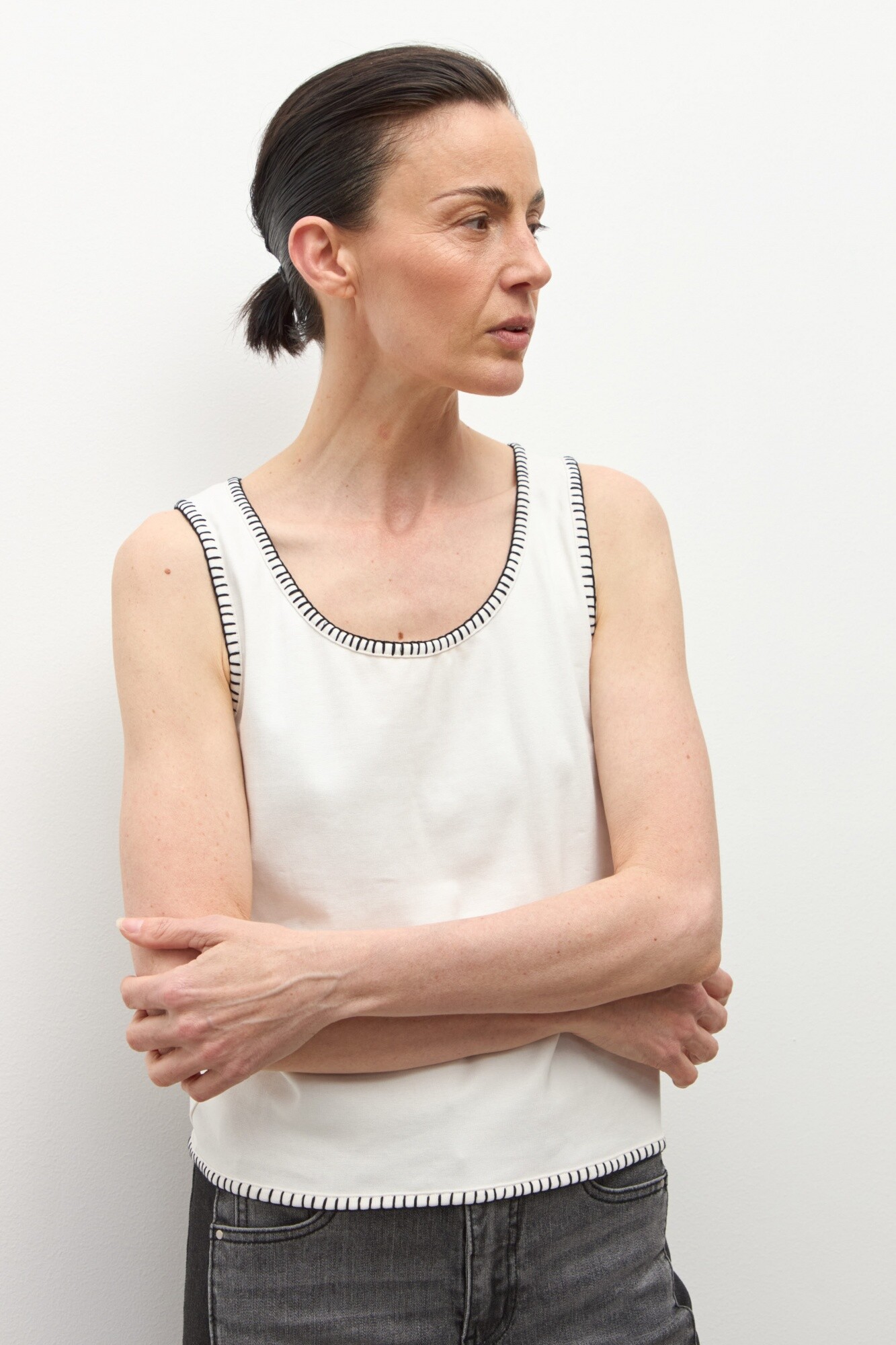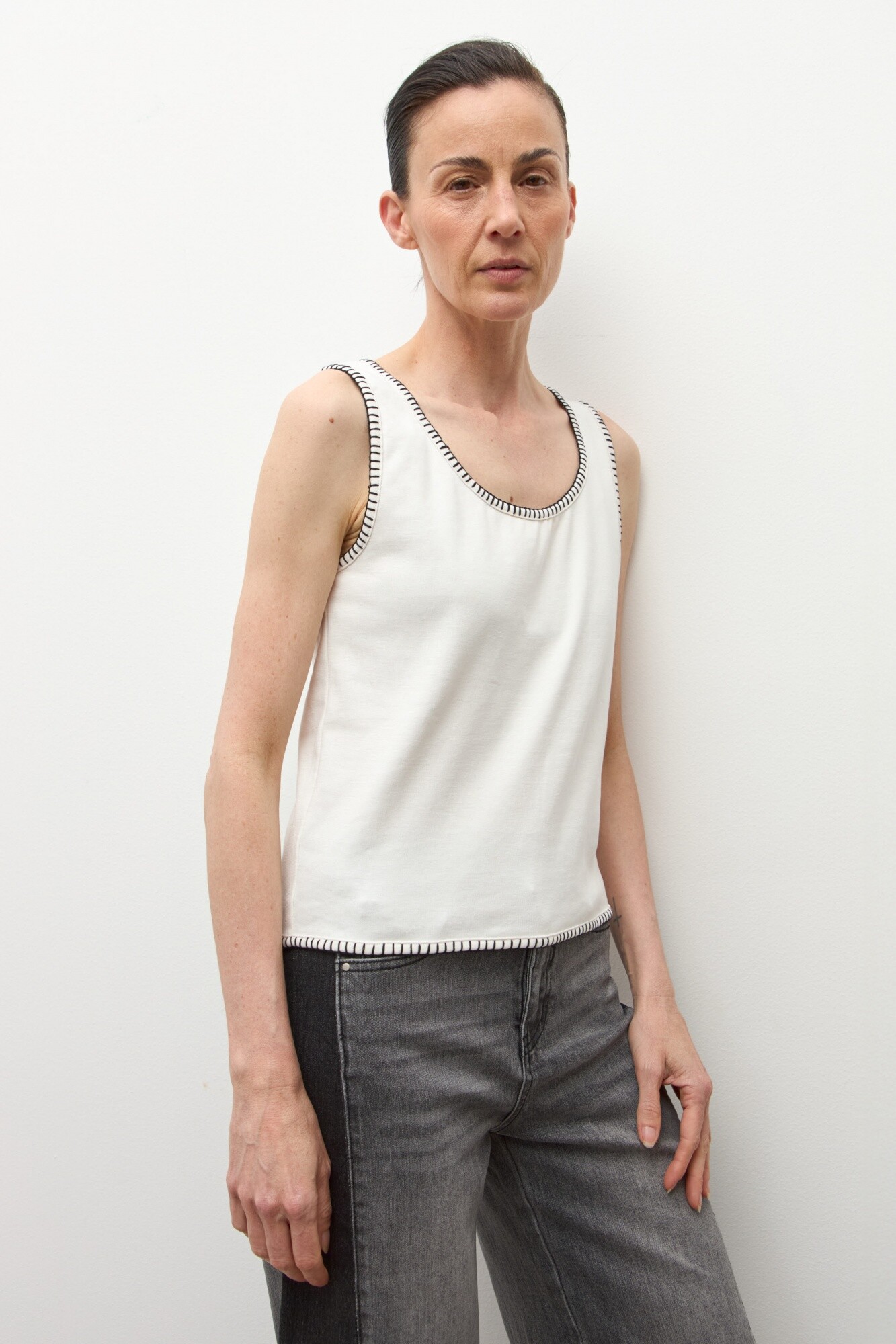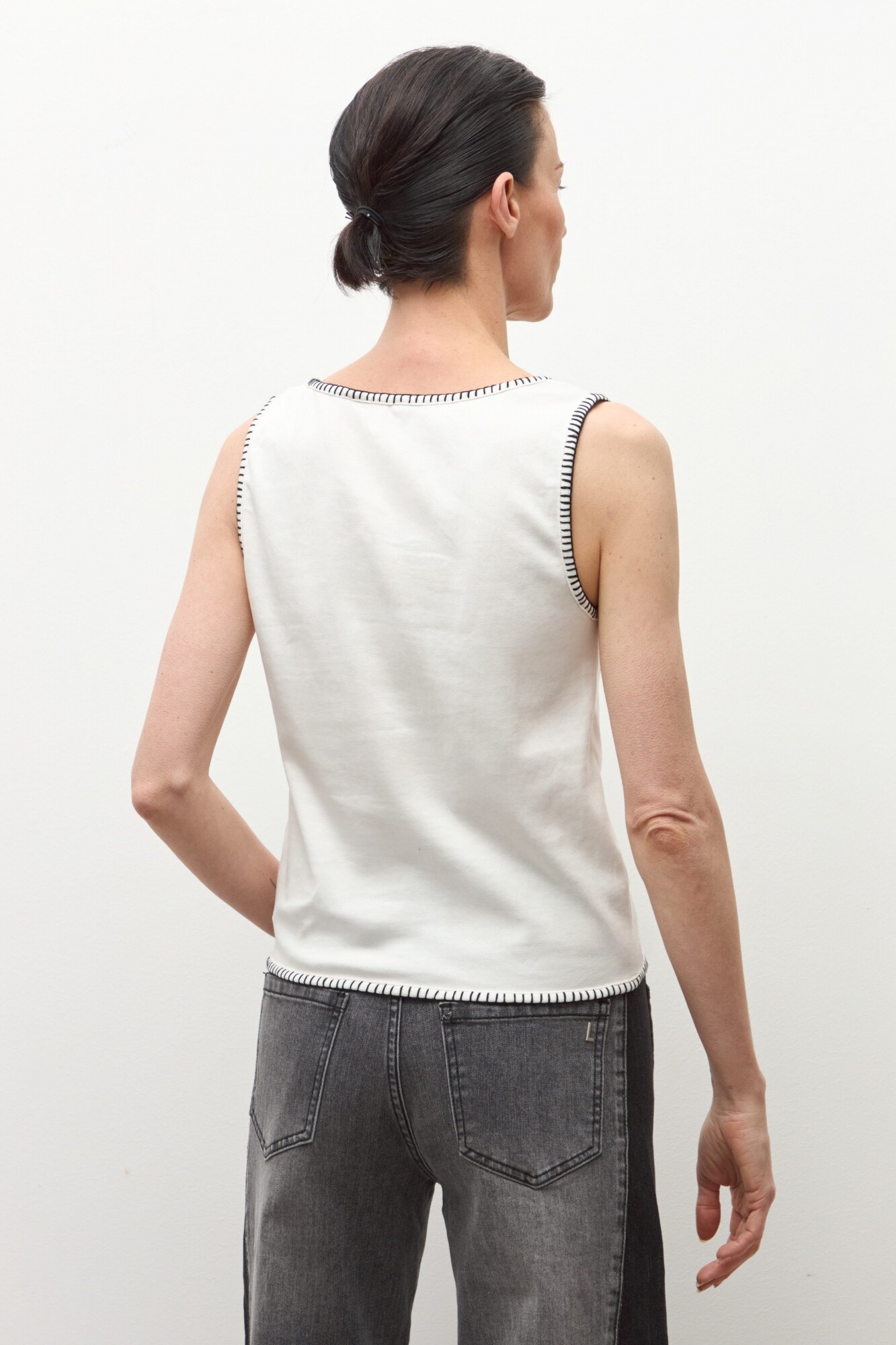 Top de escote redondo. Bordado a contratono en escote, sisa y bajo.