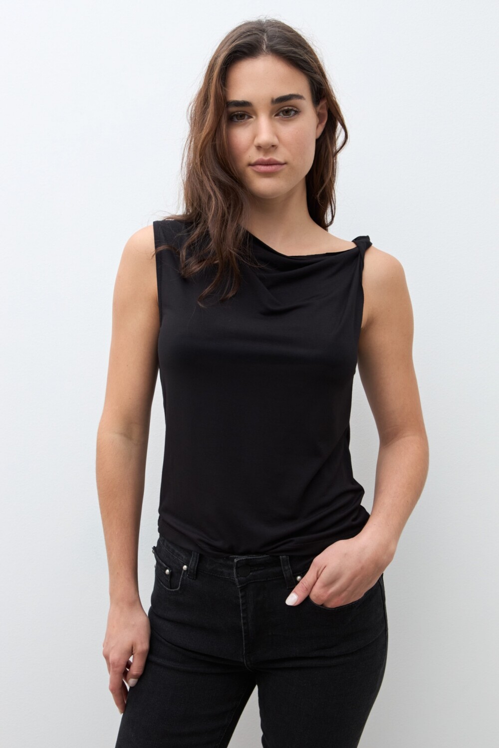 Top de escote torneado y manga sisa.
