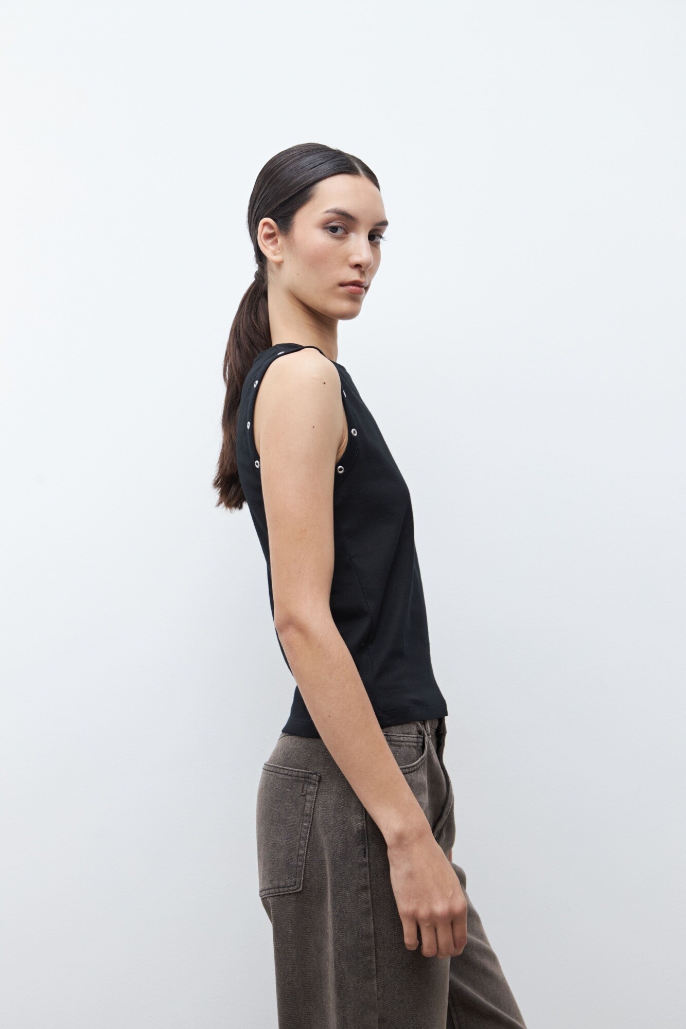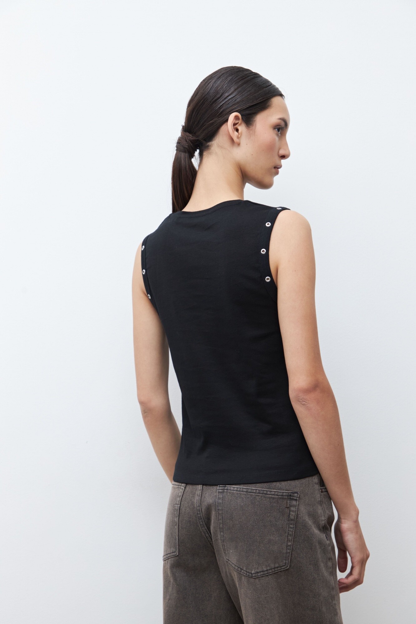 Top de escote a la base. Detalle de ojalillos metálicos en sisa.