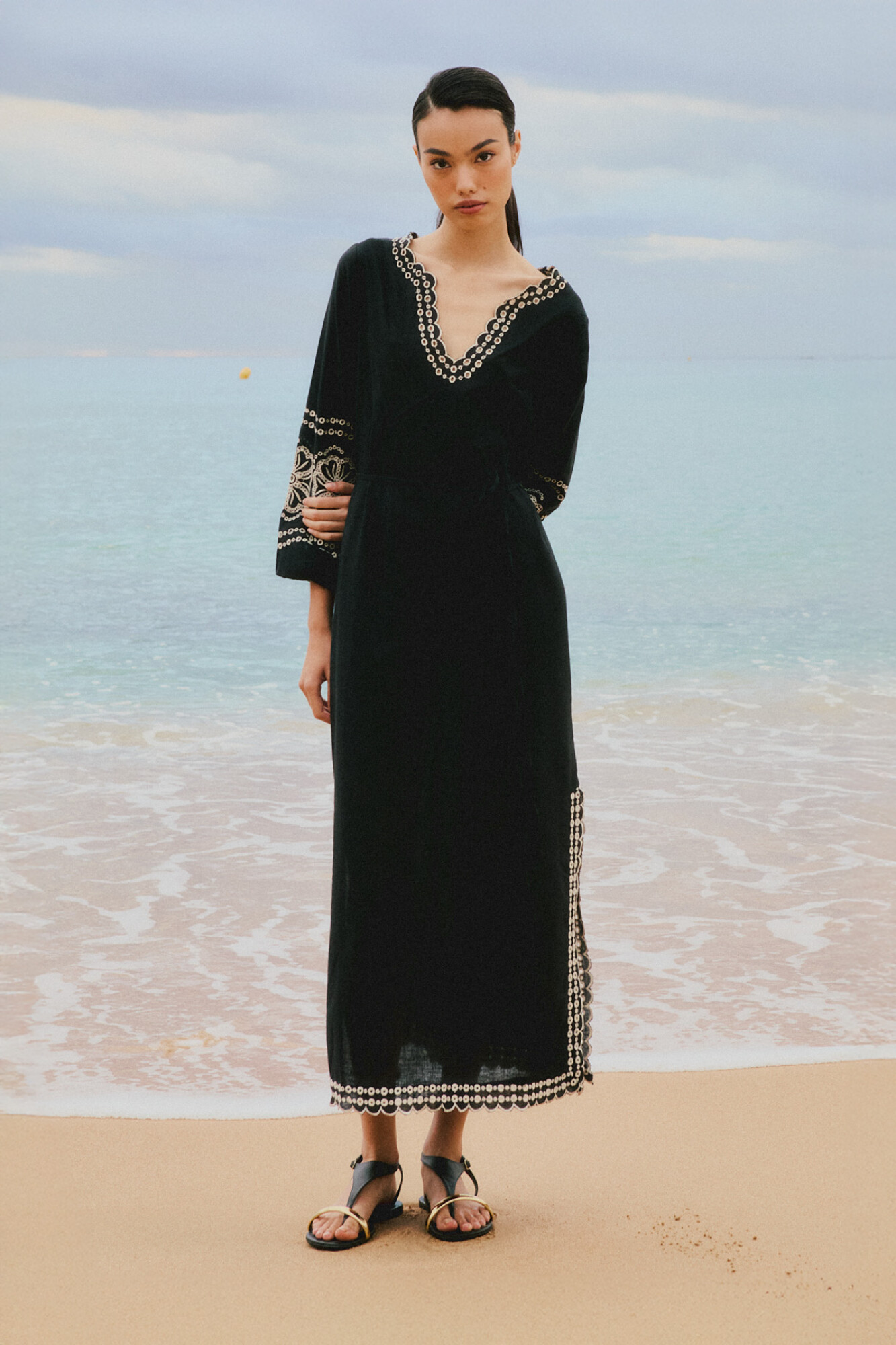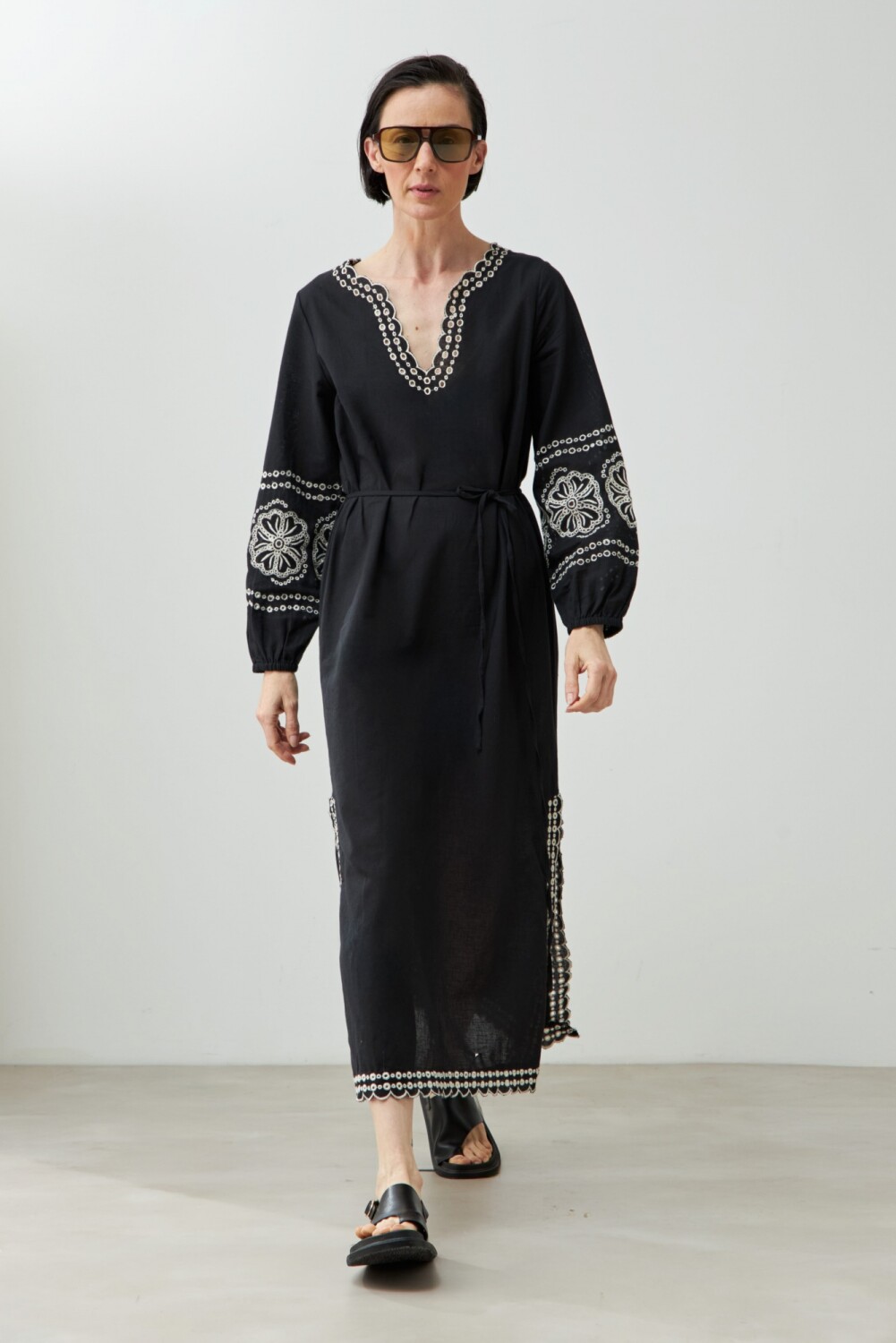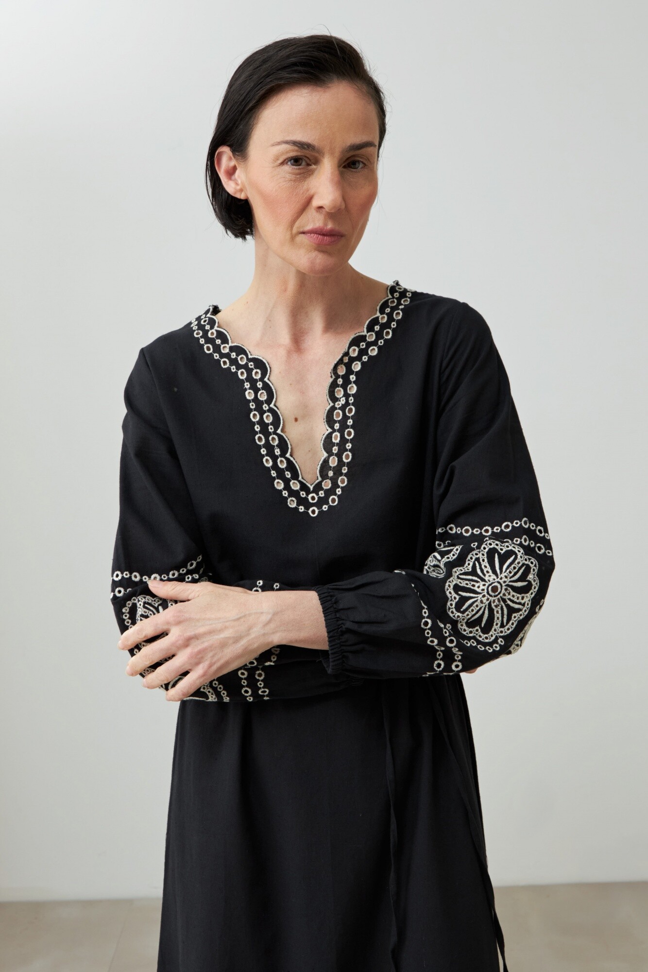 Túnica bordada de escote en V y manga larga. Tajos laterales.