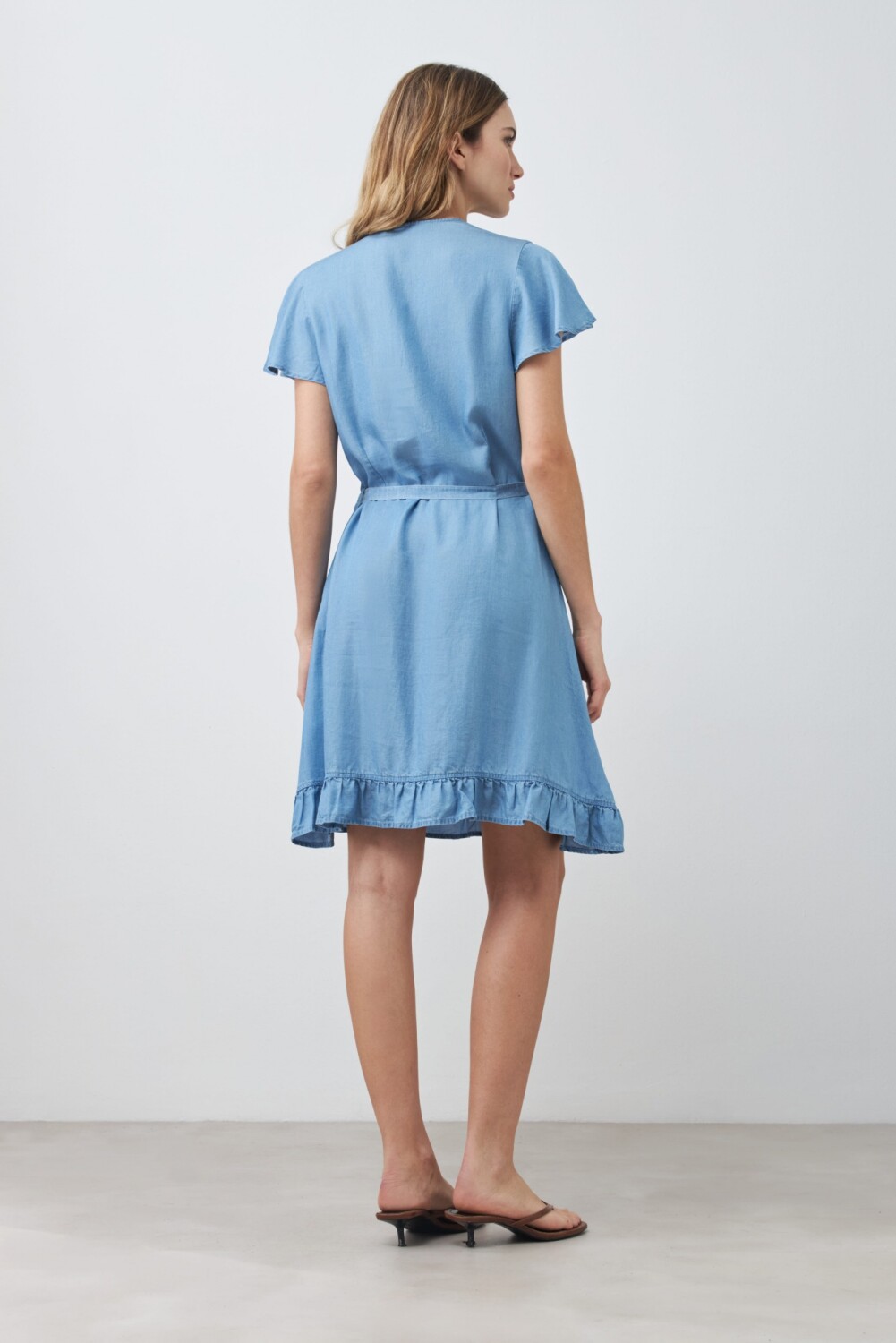 Vestido cruzado de escote en V y manga corta. Volados en bajo.