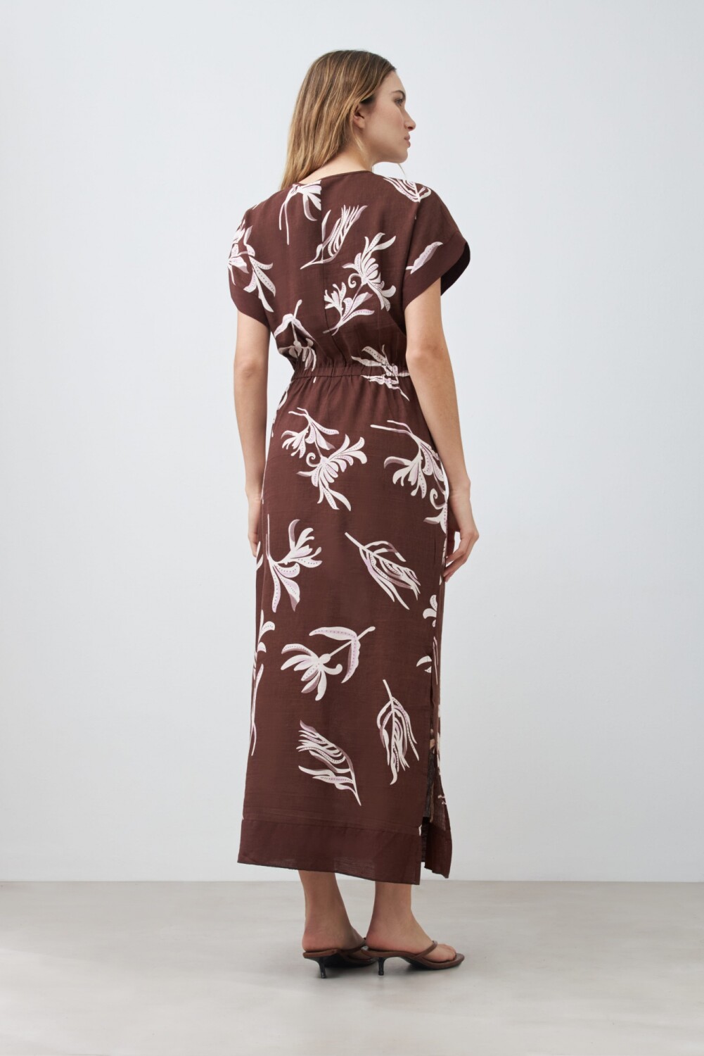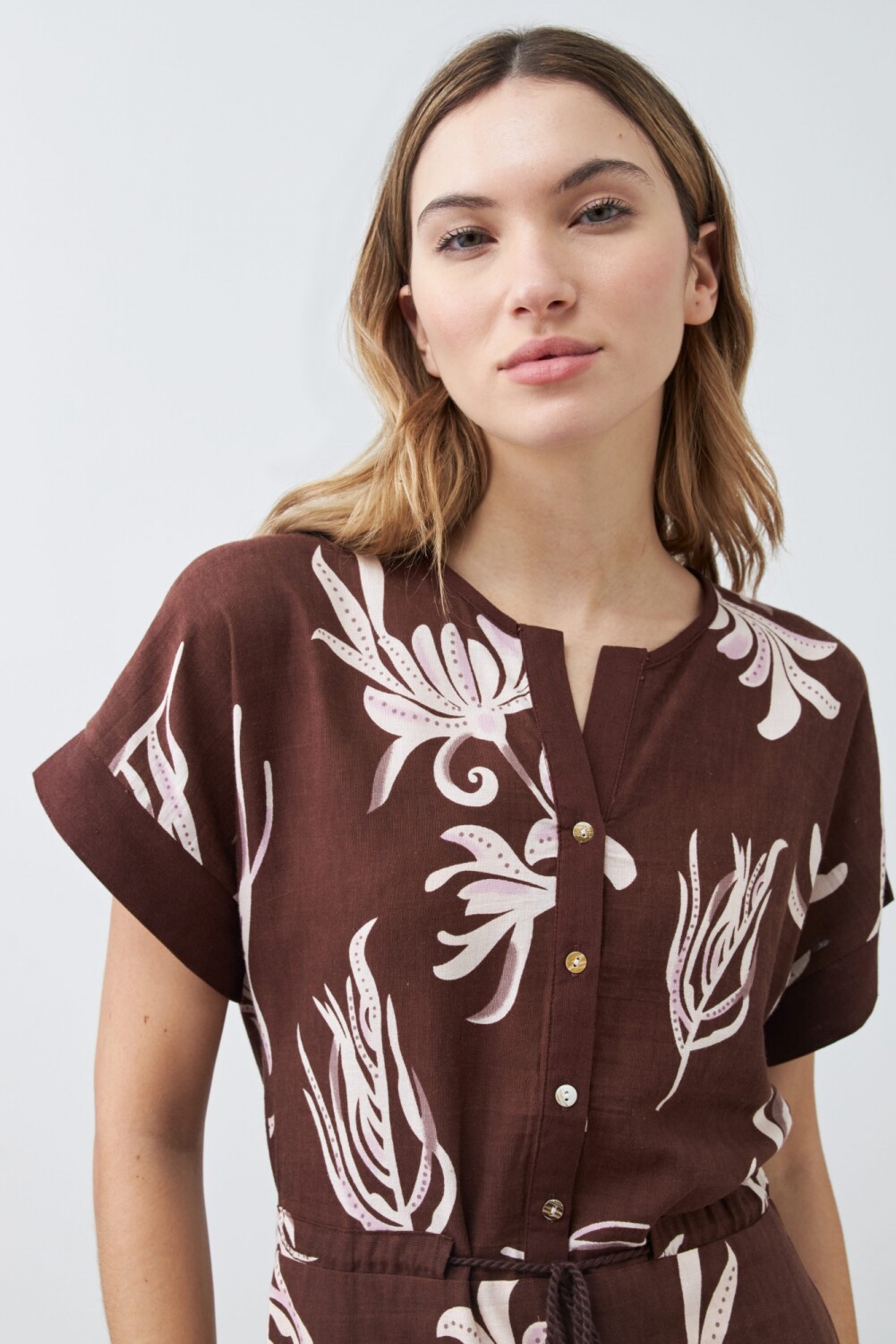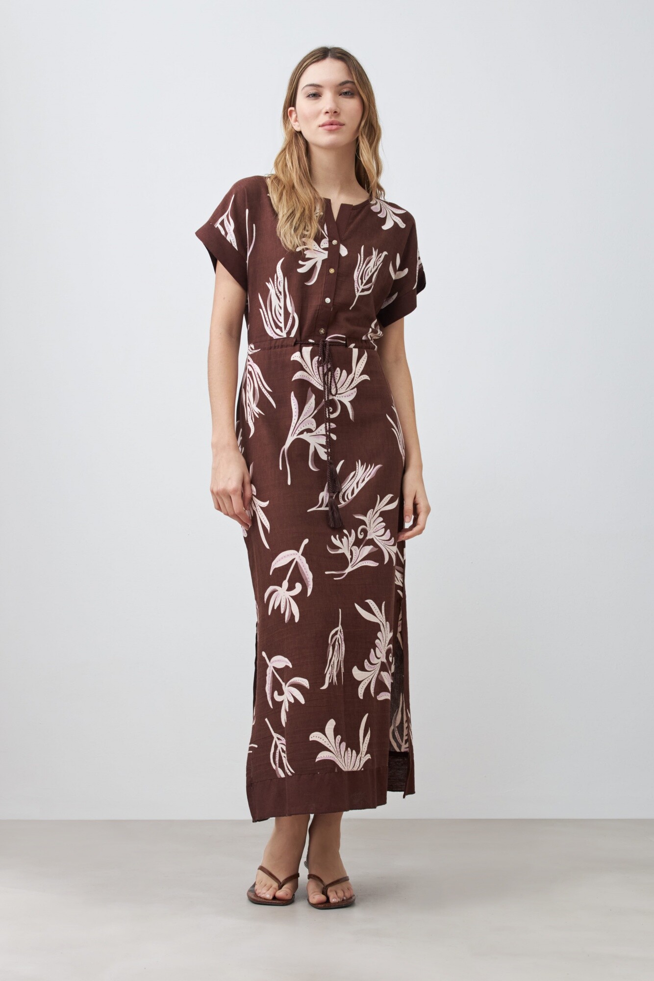 Vestido de escote a la base y manga corta. Abertura frontal con botones. Lazo de ajuste en cintura. Tajos laterales.