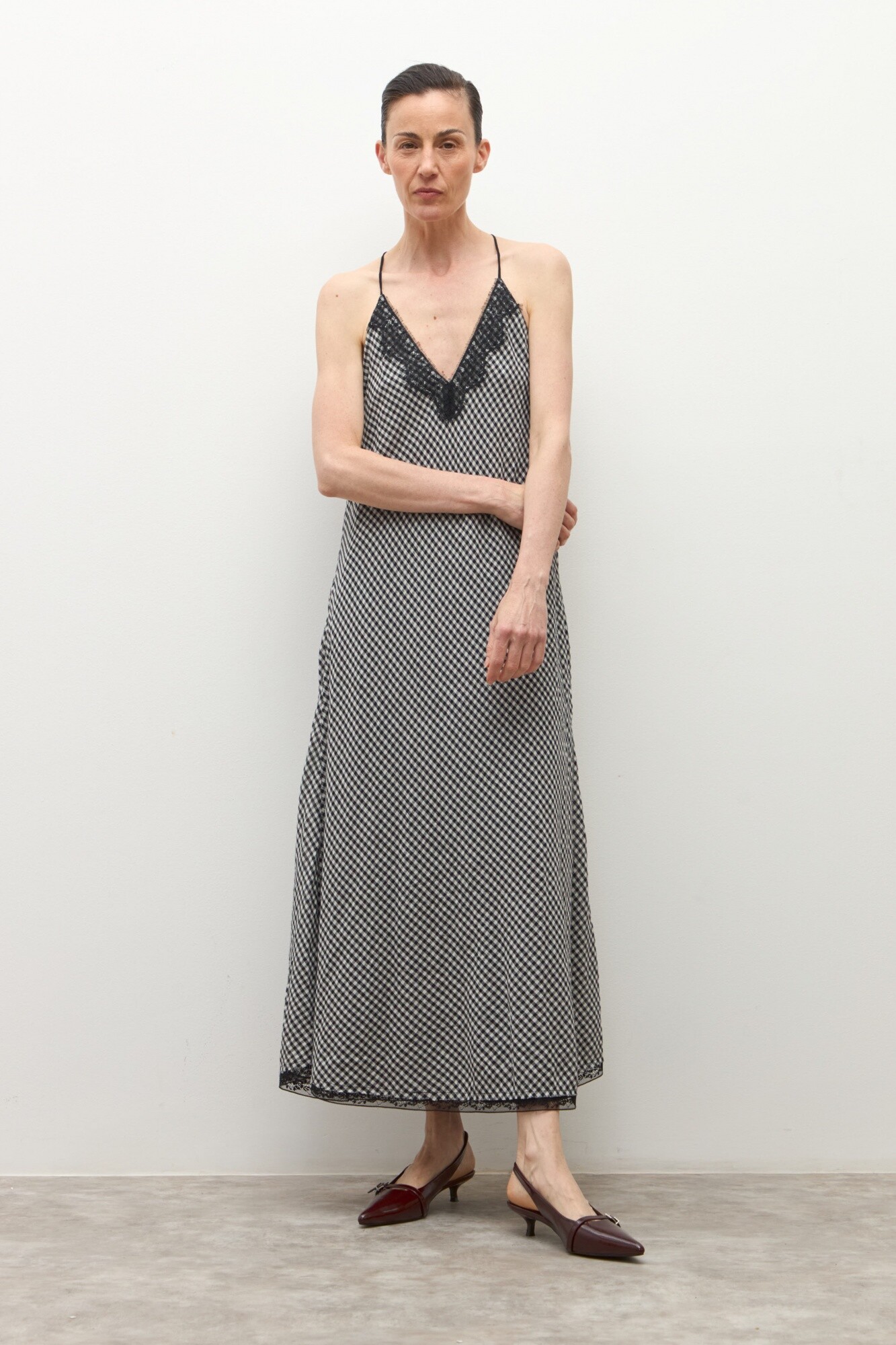Vestido de escote en V. Tirantes finos. Detalle de encaje en escote y bajo.